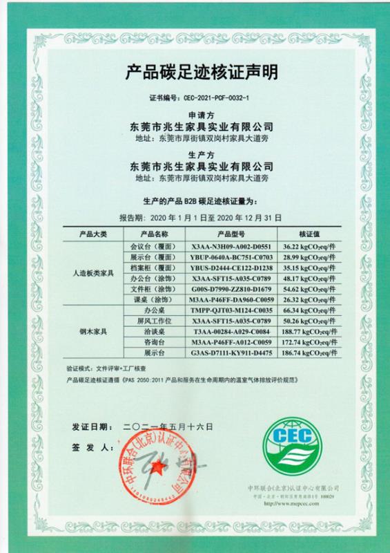 上一篇:東莞市兆生家具實業有限公司碳足跡證書-CEC-2021-PCF-0032-2 -鋼木家具+軟體家具