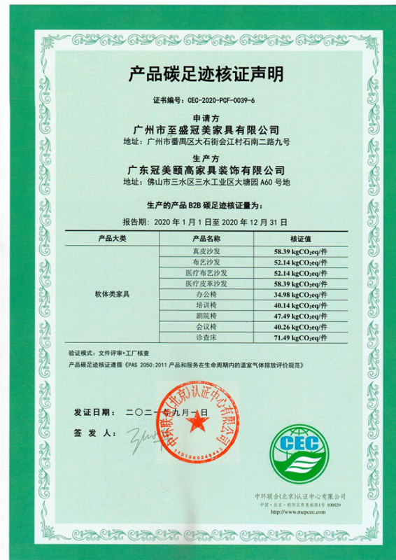 廣東冠美頤高家具裝飾有限公司碳足跡證書-CEC-2021-PCF-0039-6-軟體類家具