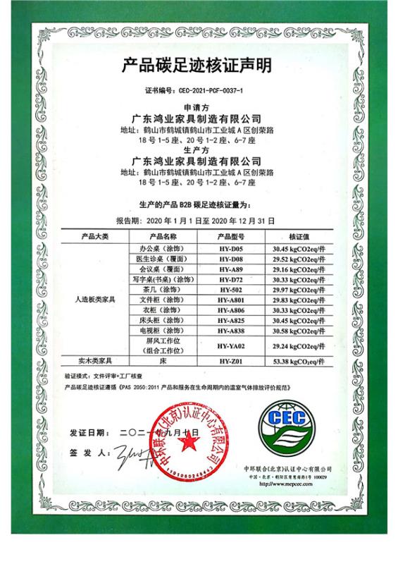 廣東省鴻業(yè)家具制造有限公司碳足跡核證聲明-CEC-2021-PCF-0037-1-人造板類實木類 家具