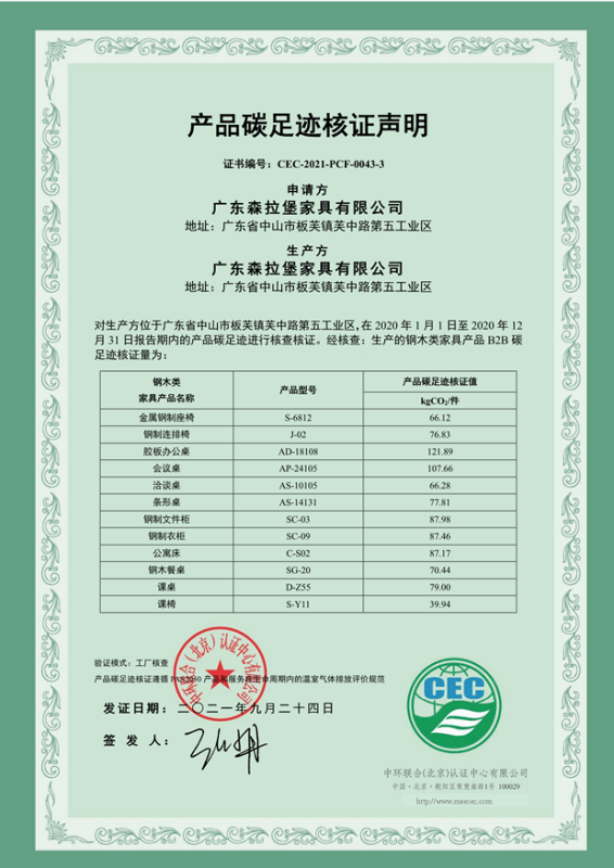 廣東森拉堡家具有限公司碳足跡證書-CEC-2021-PCF-0043-3-鋼木類家具