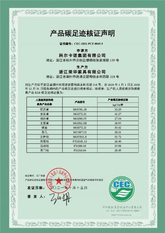浙江榮華家具有限公司碳足跡核證聲明-CEC-2021-PCF-0045-5-人造板類涂飾類家具