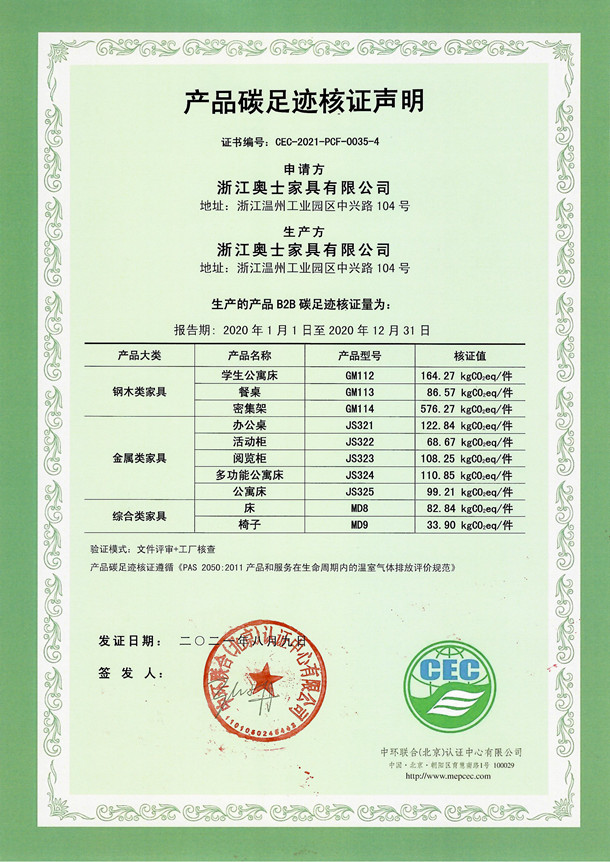 浙江奧士家具有限公司-2021-PCF-0035-4-鋼木類家具+金屬類家具+綜合類家具