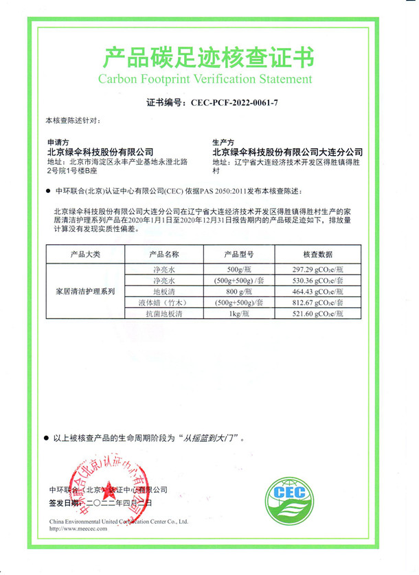 北京綠傘科技有限公司大連分公司-CEC-PCF-2022-0061-7-家具清洗護(hù)理系列