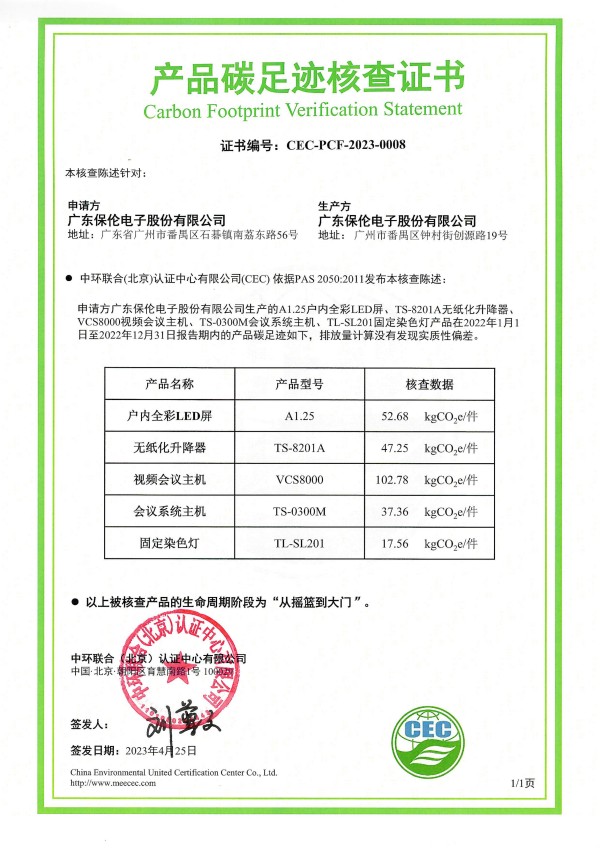 廣東保倫電子股份有限公司-CEC-PCF-2023-0008