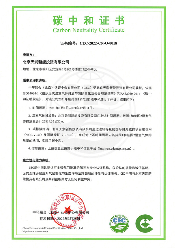 北京天潤新能投資有限公司碳中和證書-CEC-2022-CN-O-0018