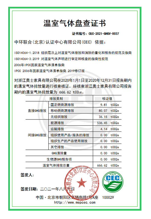 浙江奧士家具有限公司-CEC-2021-GHGV-0037-溫室氣體盤查證書