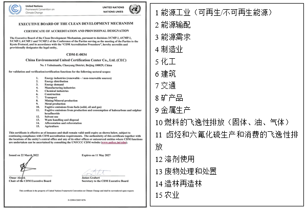 CEC被授予UNFCCC CDM以下業務領域的審定、核查/核證資質: