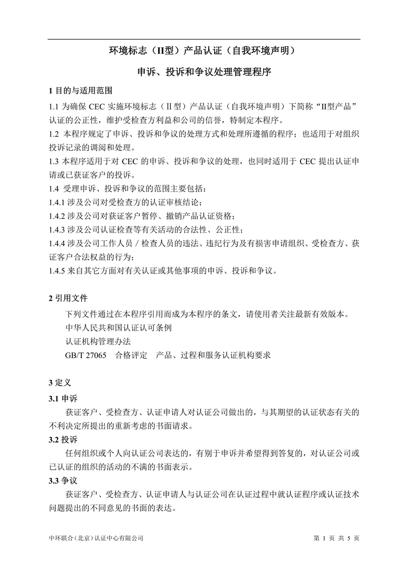 環(huán)境標志(Ⅱ型)產(chǎn)品認證(自我環(huán)境聲明)申訴、投訴和爭議管理程序-2024-7-1.pdf