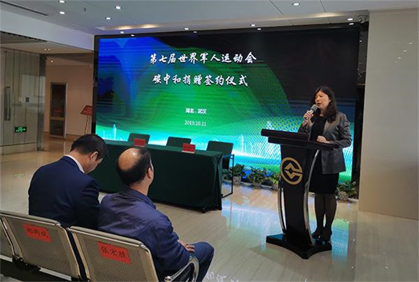 2019年10月31日,第七屆世界軍人運動會碳中和發布會暨碳中和捐贈簽約儀式在湖北省碳排放權交易中心舉行。中環聯合總經理張小丹出席發布會,并為湖北省生態環境廳頒發碳中和證書。