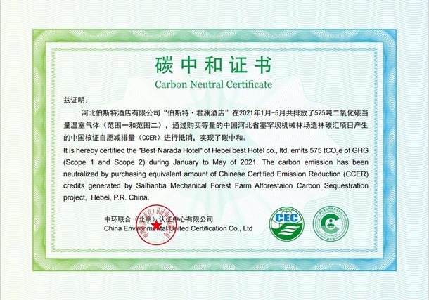 依據相關國際國內核算標準,經中環聯合核查確認,2021年1月至5月期間,圍場縣塞罕壩伯斯特君瀾酒店運營中,化石燃料燃燒排放、逸散排放、外購電力所導致的間接排放等共計575噸二氧化碳當量(范圍一和范圍二),該酒店購買了等量的河北省塞罕壩機械林場造林碳匯項目產生的中國核證自愿減排量進行抵消,實現了特定時段的運營排放碳中和。未來該酒店將在運營管理中,繼續開展節能提效、鼓勵綠色住店、加強碳排放管理,持續打造碳中和酒店。