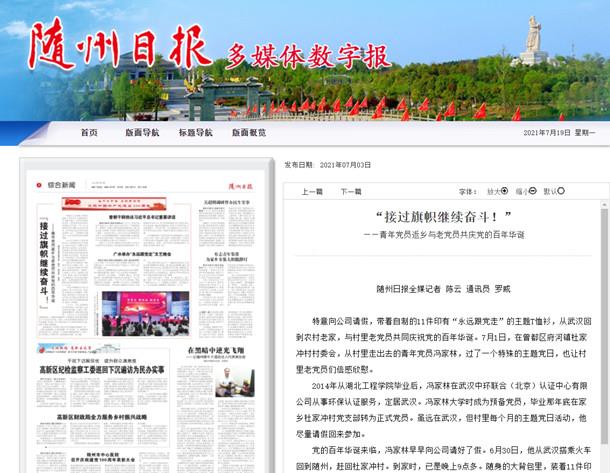 1.隨州日報《接過旗幟繼續(xù)奮斗!”——青年黨員返鄉(xiāng)與老黨員共慶黨的百年華誕》鏈接:http://szrb.suiw.cn/szrb/20210703/html/content_20210703003001.htm