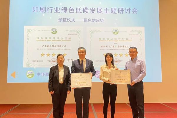 倡議儀式后,陳軼群副總經(jīng)理和陳寶湘副秘書長為當(dāng)納利(廣東)印務(wù)有限公司、廣東新華印刷有限公司、廣東一龍印刷有限公司頒發(fā)了綠色供應(yīng)鏈評(píng)價(jià)證書及低VOCs印刷品產(chǎn)品認(rèn)證證書。