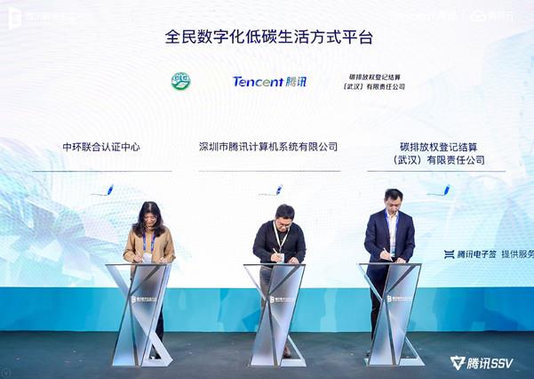 會上,中環聯合認證中心與深圳市騰訊計算機系統有限公司和碳排放權登記結算(武漢)有限責任公司達成深度合作,共同搭建“全民數字化低碳生活方式平臺”。