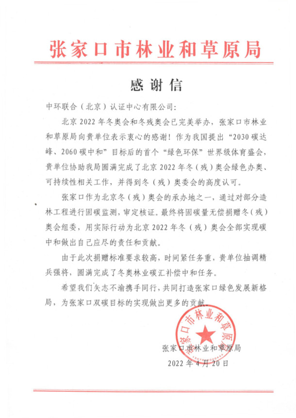 中環(huán)聯(lián)合(北京)認(rèn)證中心有限公司(以下簡稱中環(huán)聯(lián)合)作為張家口市冬奧林審定核證機(jī)構(gòu),在此次捐贈(zèng)標(biāo)準(zhǔn)要求較高、時(shí)間緊任務(wù)重的情況下,對“京冀水源林張家口冬奧碳中和碳匯項(xiàng)目”監(jiān)測期所產(chǎn)生的的林業(yè)碳匯量進(jìn)行了審核,并編制提交了《京冀水源林張家口冬奧碳中和碳匯項(xiàng)目碳減排量核證報(bào)告》,協(xié)助張家口市圓滿完成了冬奧林業(yè)碳匯補(bǔ)償中和任務(wù)。近日也收到了來自張家口市林業(yè)和草原局的感謝信。