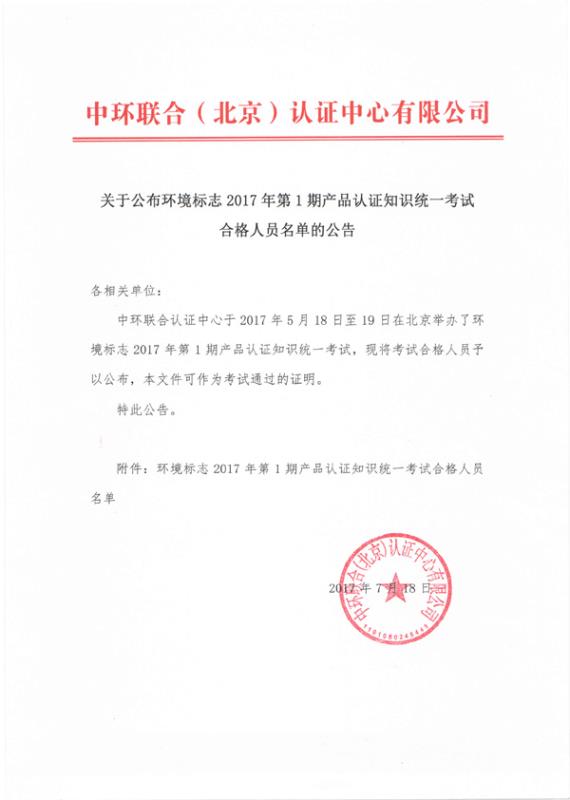 關于公布環境標志2017年第1期產品認證知識統一考試 合格人員名單的公告