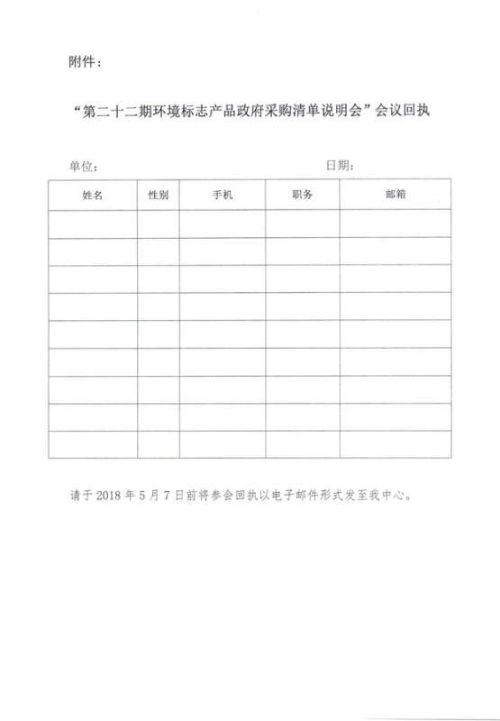 “第二十二期環(huán)境標(biāo)志產(chǎn)品政府采購(gòu)清單說(shuō)明會(huì)”會(huì)議回執(zhí)