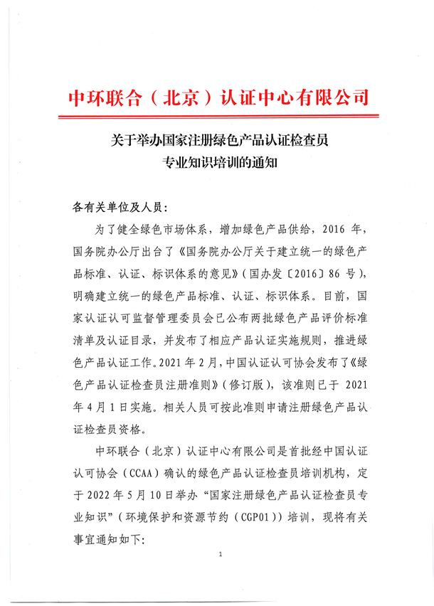 綠色產(chǎn)品檢查員專業(yè)知識(shí)培訓(xùn)通知
