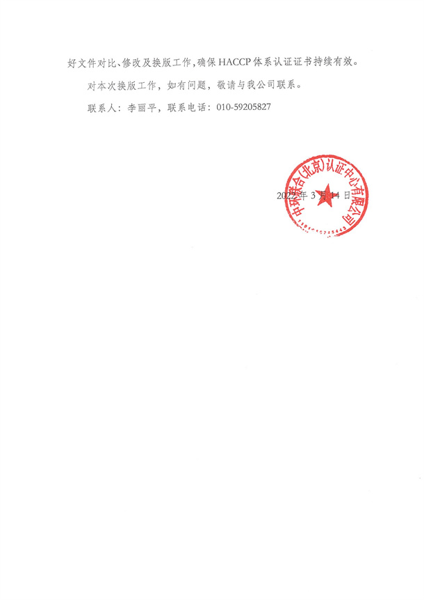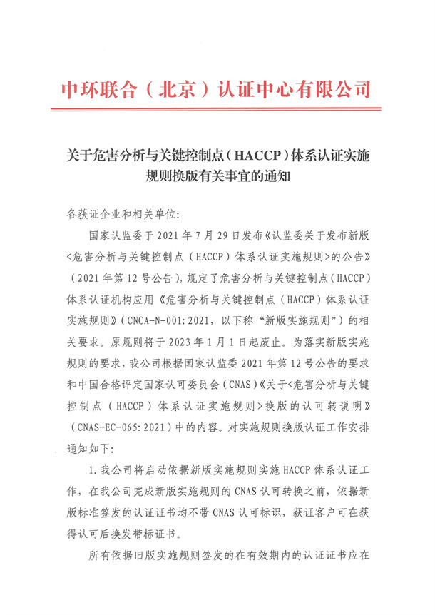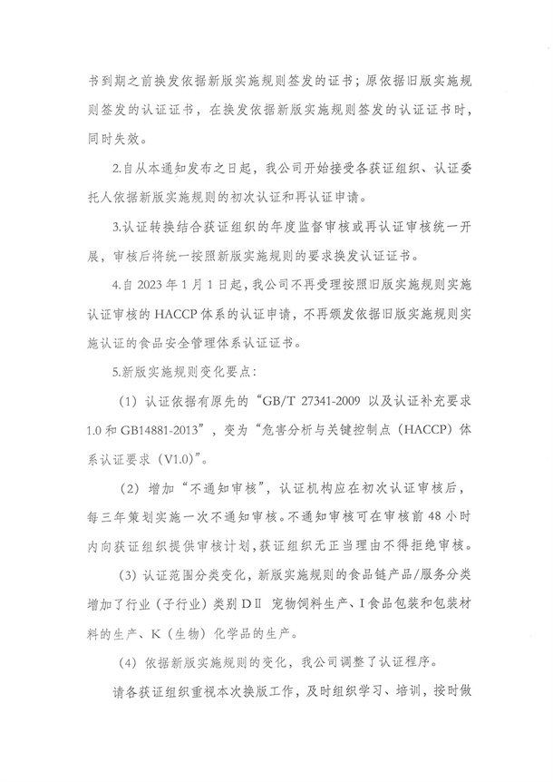 關(guān)于危害分析與關(guān)鍵控制點(HACCP)體系認(rèn)證實施規(guī)則換版有關(guān)事宜的通知